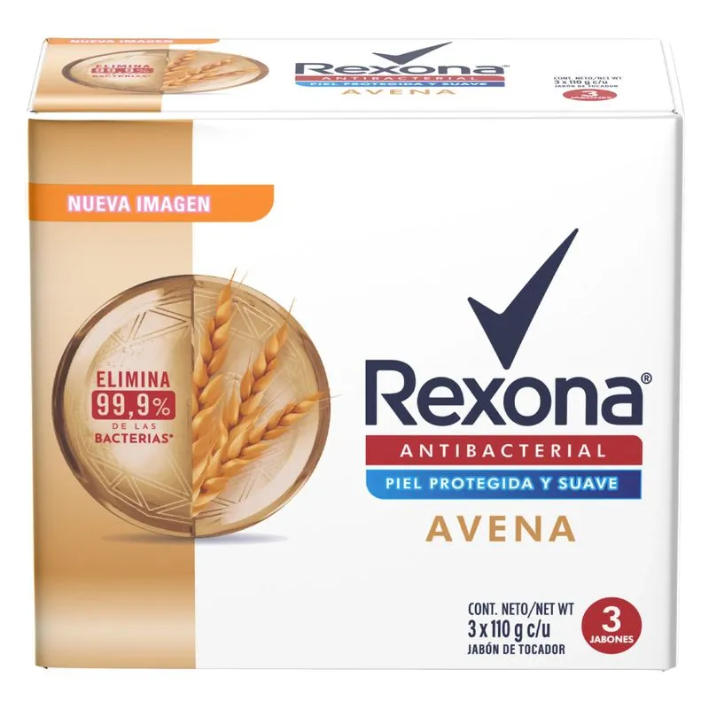 3 Jabones Rexona Antibacterial Avena 110g ofrecen una limpieza profunda que elimina hasta el 99.9% de las bacterias, cuidando la piel gracias a las propiedades suavizantes de la avena.