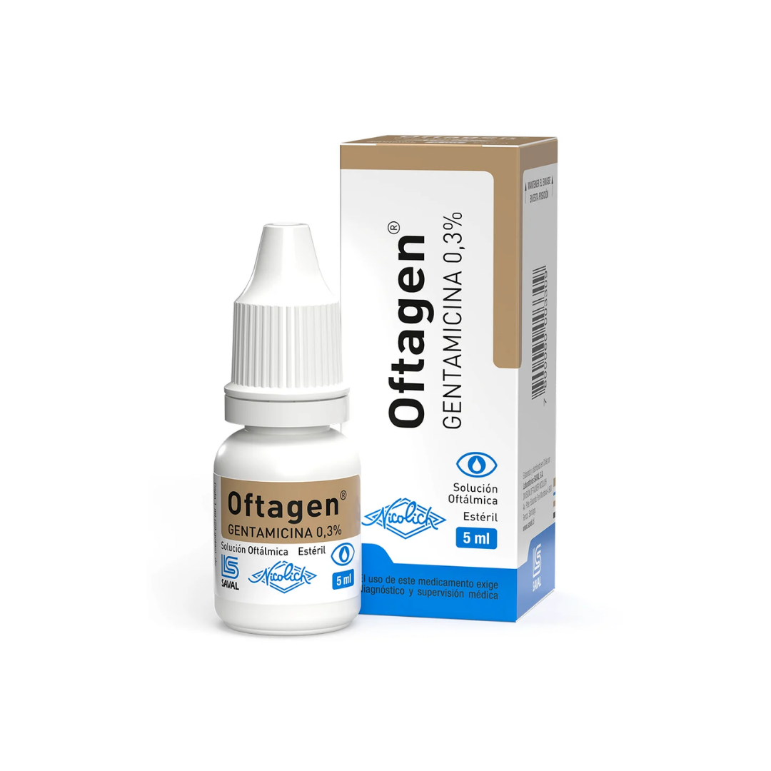 La solución oftálmica Oftagen de 5 ml contiene Gentamicina al 3%, un potente antibiótico indicado para el tratamiento de infecciones bacterianas externas del ojo y sus anexos; este producto requiere fórmula médica, debe utilizarse estrictamente bajo supervisión profesional para evitar efectos adversos.